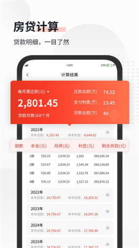 4、一目了然的贷款明细结果,该结果中展示期数、偿还本金、偿还利息和月供数据。