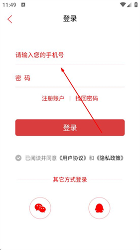 2、在登录页面,可输入手机号和密码登录,也可选择微信、QQ等其他登录方式。