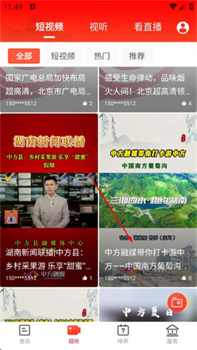 3、登录后进入视听板块可查看短视频、视听、看直播等内容,选择感兴趣的短视频或直播进行观看。