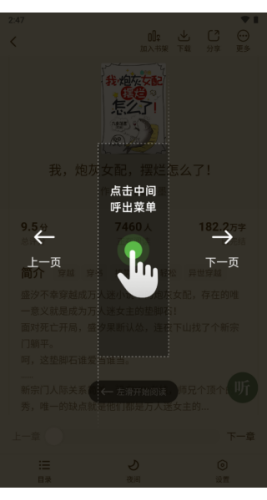 3、查看阅读教程,可以直接用手指滑动阅读,并查看菜单设置等等。
