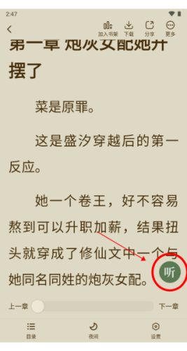 4、教程查看完后就可以开始阅读了,下方点击听就可以进入听小说模式。