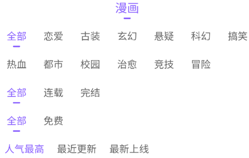 5、十大漫画分类精准检索,包含热血恋爱悬疑科幻等题材,支持作者名漫画名快速搜索。