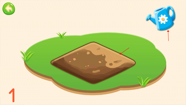 3、点击数字1.会看到左下角有一个数字1.右上方有一个水壶,中间有一块土地,将壶里面的水倒到土地上。