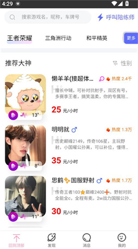 3、在首页浏览平台上的游戏和陪玩列表,根据自己的游戏喜好和需求,选择心仪的陪玩师。
