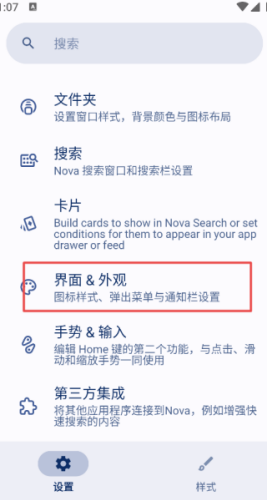 2、在设置界面,我们可以往下拉,找到界面/外观功能,点击会再次跳转。