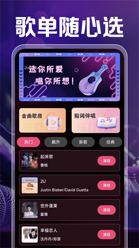 2、海量高品质伴奏曲库,新歌热歌一网打尽,你想唱的这里都有。