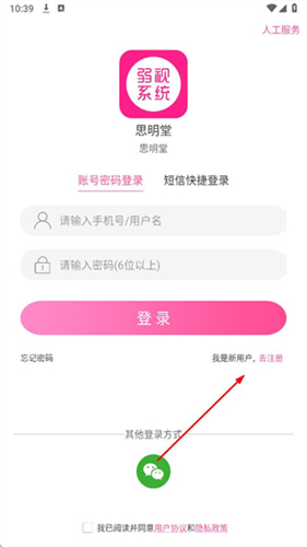1、打开APP,在登录页面点击我是新用户,去注册。