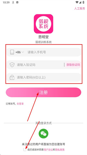 2、输入手机号、填入验证码、设置密码,勾选用户协议和隐私政策,点击注册。