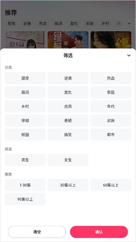2、也可以点击上图右侧的扩展按钮(上图红色箭头所指),来选择短剧的类型、剧集等参数来筛选。