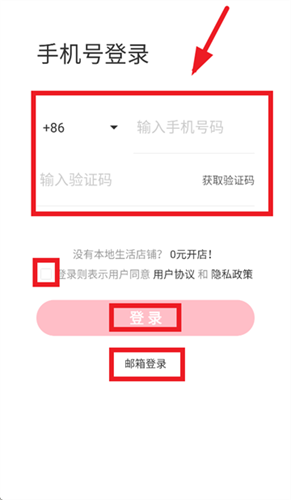 3、输入手机号,验证码,勾选登录则表示用户同意用户协议和隐私政策,点击登录即可,还可以点击邮箱登录,使用邮箱,密码登录