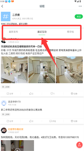 3、在具体话题页面,可切换不同排序方式浏览相关内容。