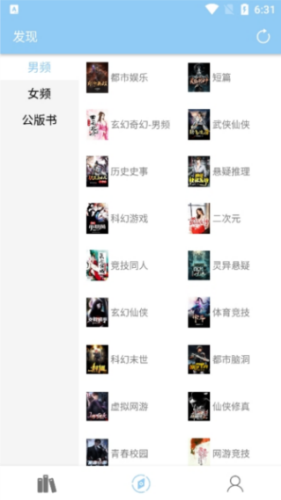 2、进入底部中间的发现板块,软件按男频、女频和公版书进行了分类,用户可以按喜好选择阅读。