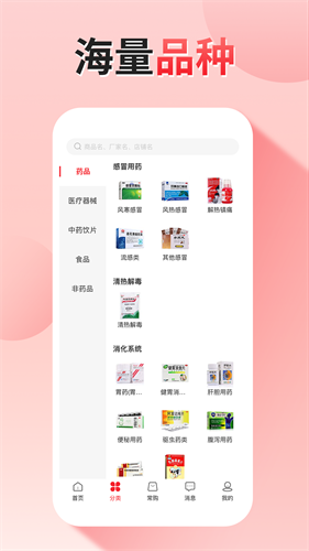 应用按照药品的类型展示药品资源,让用户能够选择品种查找相关的药品。