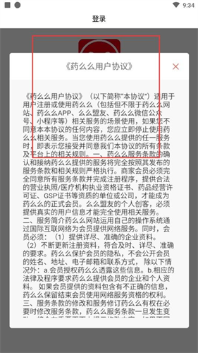 2、登入弹出药么么用户协议说明适用场景及用户商家等权利义务内容详尽规范。