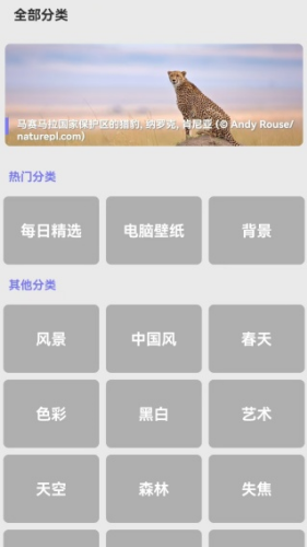 2、【热门分类】还提供了热门分类服务,便捷、高效的壁纸搜索体验。选择不同的热门分类,如自然风光、动物植物、人物明星、美食餐饮等,来快速、准确地找到自己想要的壁纸资源,提高用户的壁纸搜索效率。
