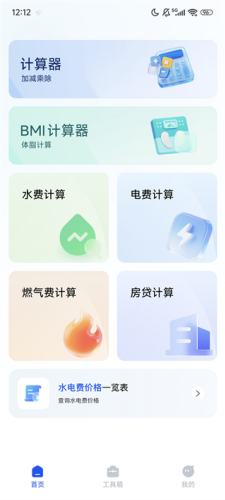 2、首页提供计算器、水费、电费、燃气费、房贷等计算功能。