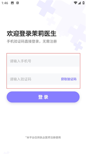 1、进入登录页,输入手机号获取验证码,点击登录,进入医生认证页,填写姓名医院等信息。