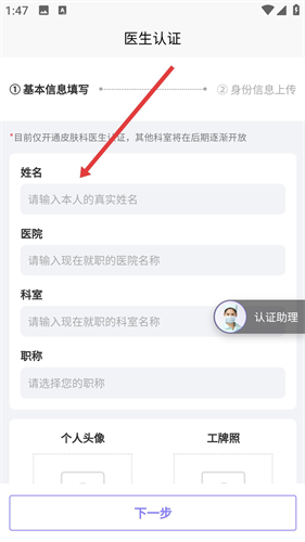 2、在医生认证页填完基本信息,上传头像工牌,点下一步,完成认证后进入医助对话页。