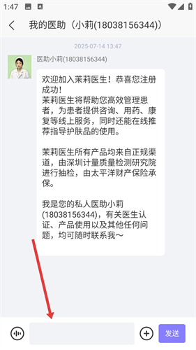 3、进入医助对话页,查看注册成功提示,点击输入框,咨询认证或产品使用等相关问题。