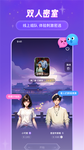 1、双人密室逃脱为核心玩法,支持实时语音协作破解机关与合成道具,增强互动沉浸感。