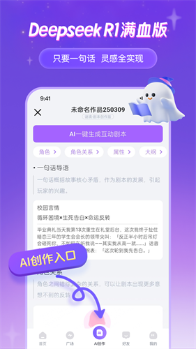 关键词→世界观→角色介绍和关系图谱→剧情大纲→分镜脚本→交互配置,全流程AI工作流覆盖,所有灵感轻松落地。