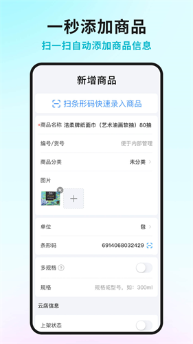 4、扫一扫极速入库: 智能商品库自动识别信息,提供销售建议,快速入库成百上千商品。