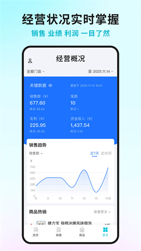 4、在报表分析模块,查看每日收支和销售趋势,简单点击生成图表,数据一目了然,辅助你做出更明智的决策。