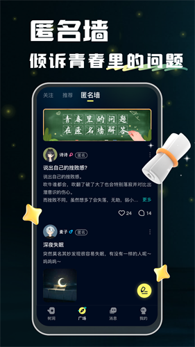 用户可以在匿名墙说出自己的心声,让其他用户给自己提出建议对自己进行开导。