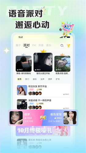 支持派对交友,可以任意加入各样派对进行多人聊天、互动交友。