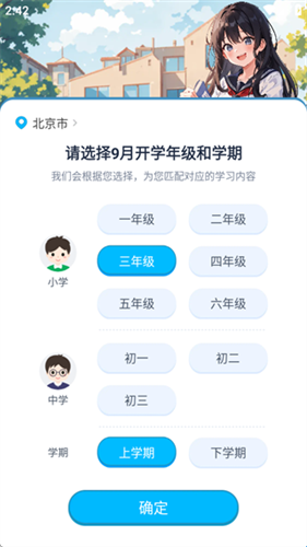 1、打开app,根据系统提示选择开学年级和学期,点击确定然后进入。