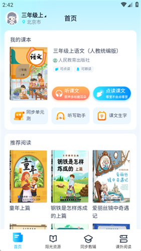 2、进入app就能看到系统推荐的学习资源,还可以点读课文。