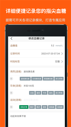 4、可以快速记录血糖水平,同时也可以记录饮食、运动和药量等相关数据。