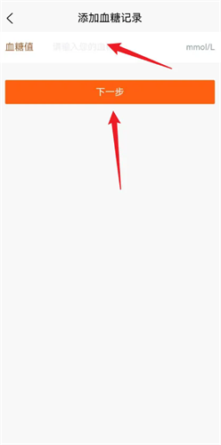2、进入到添加血糖记录页面,输入血糖值,之后点击“下一步”。