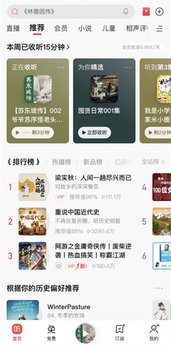 在主页中汇集了不同的热门作品,为你展示当下最流行的听书内容。