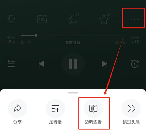 2、部分音频在进入播放页面后会直接显示文稿。若未在播放页面显示,可以点击进度条上方位置的【...】标识并选择【边听边看】,进入全屏阅读后查看文稿。
