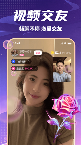 3、涵盖视频偶遇、语音速配、恋爱交友等多种场景,增加交友趣味性和可能性。