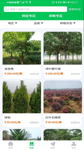 6、平台包含很多树苗类型和资源。在这里可以搜索各种树苗和草坪资源。你可以在这里买到工程苗或果树。