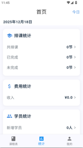 3、点击统计,可以实时当前的排课统计、费用统计、学员统计等服务。