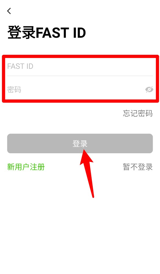 1、打开FAST ID应用,输入账号和密码后点击登录即可进入系统,支持新用户注册与跳过登录。