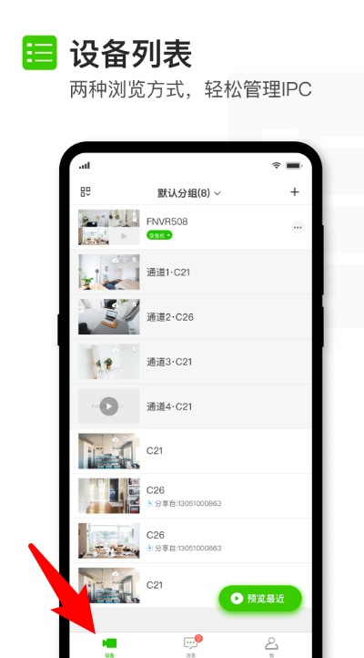 2、进入设备列表页面后,可查看所有已添加的摄像头设备,支持分组管理和快速预览功能。