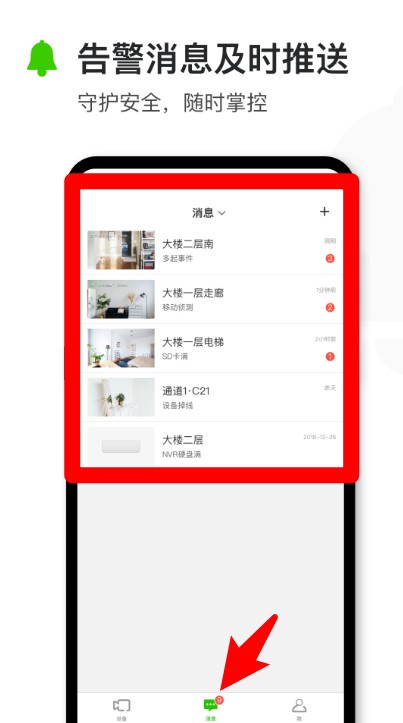 4、点击消息中心可查看告警信息推送,第一时间了解设备动态,随时掌控监控区域安全状态。