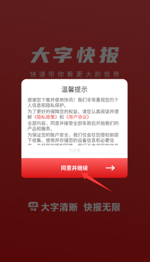 1、启动大字快报APP后,首次使用需阅读并同意用户协议和隐私政策,点击确认进入主界面。