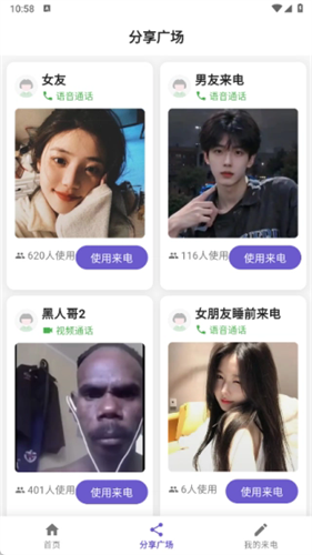 3、分享广场页面里提供了大量来电模拟选项,你可以随时选用自己喜欢的来电模拟功能。