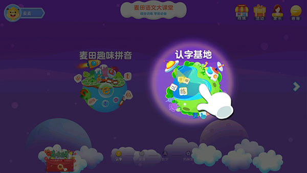 2、进入软件,我们选择认字基地,即可开始学习认识汉字了。