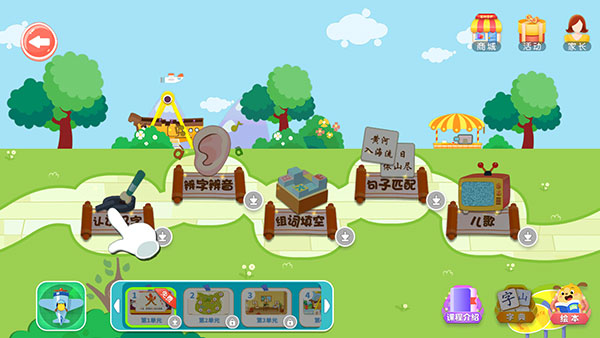 1、进阶式课程:童话故事、汉字演变、汉字游戏、词语游戏、句子游戏五个模块。