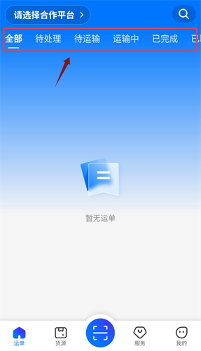 2、运单界面分类展示全部、待处理、运输中及已完成等状态。