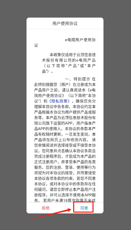 1、刚打开软件,先仔细阅读屏幕弹出的软件协议,确认没问题后点击同意按钮。