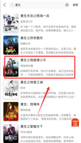 3、比如以重生为例,可以在搜索结果中找到你感兴趣的小说点击进入。