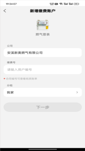 3、选择所属燃气公司,并输入用户编号,确认无误后,点击下一步。
