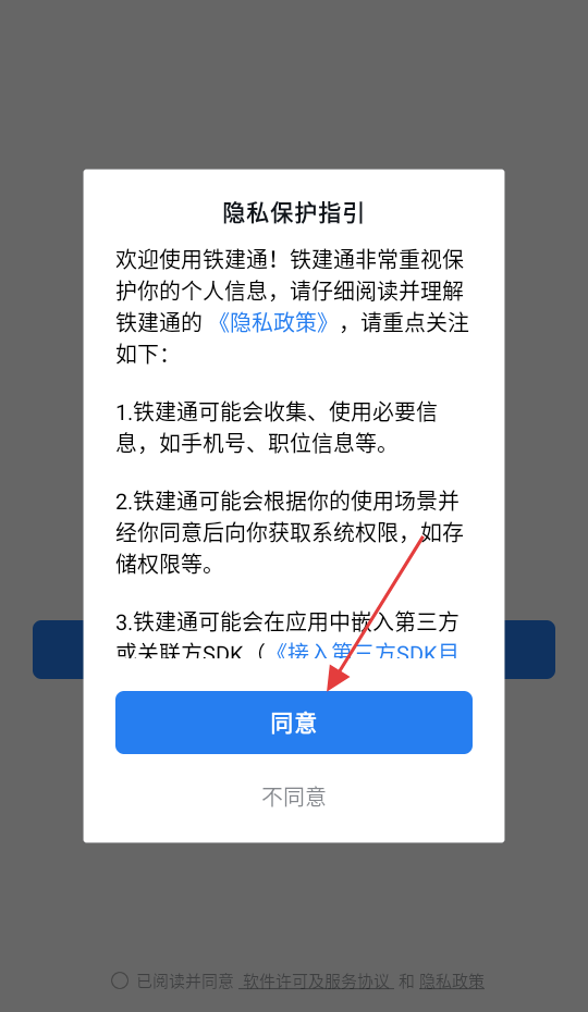 1、点击同意接受铁建通隐私保护指引。
